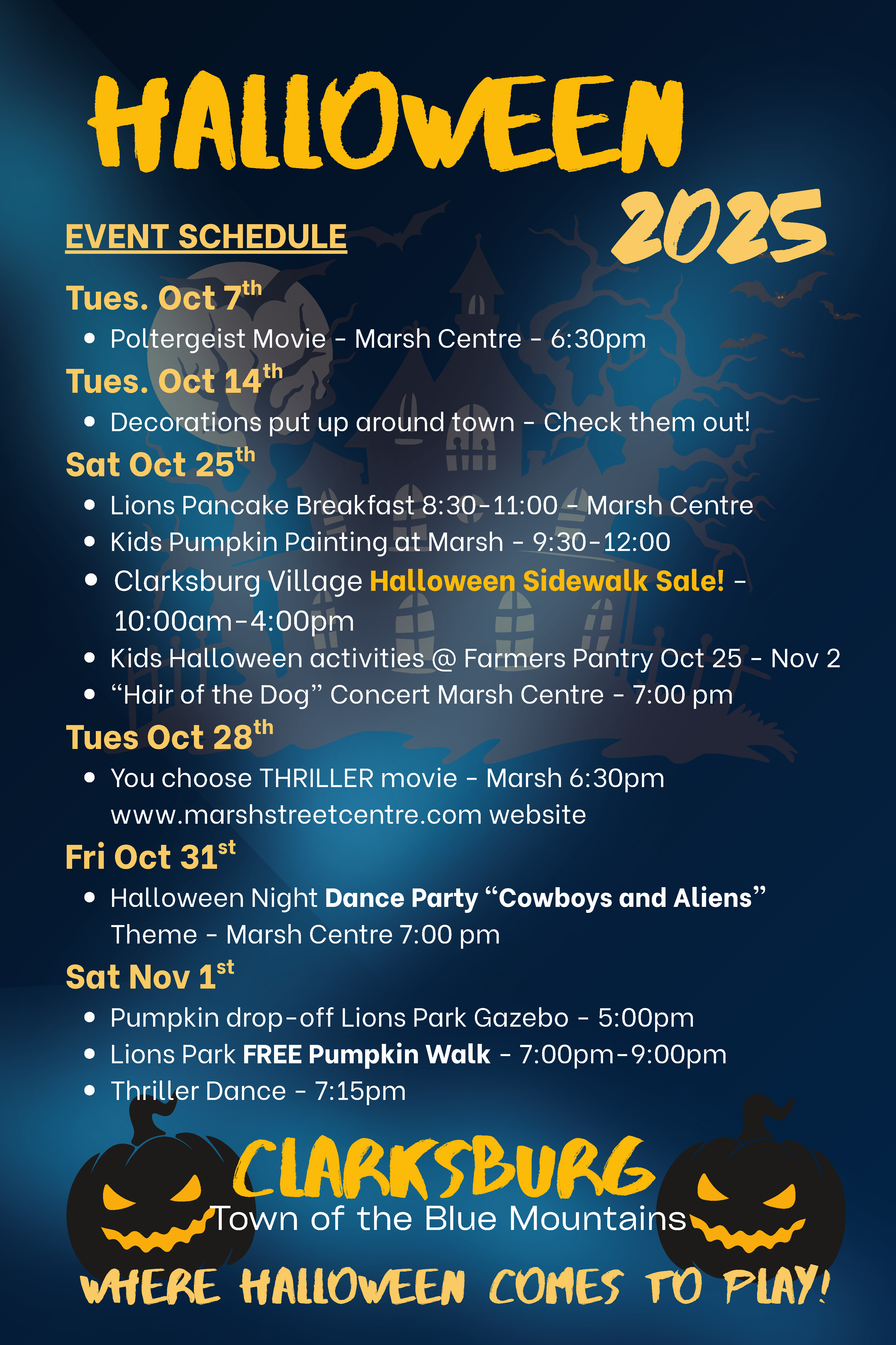 Clarksburg and The Marsh Street Centre are going to OWN Halloween this year.There will be decorations, movies, pancake breakfast (brought to you by the Lions), Pumpkin Painting, Retailer Sidewalk Sale, a Rock Concert, a Halloween Party based on Cowboys and Aliens, and finally a Pumpkin Walk in Lions Park and a Thriller Dance!Make your way down to Clarksburg and the Marsh from Oct 14th through to Nov 1st. Event Schedule is below: