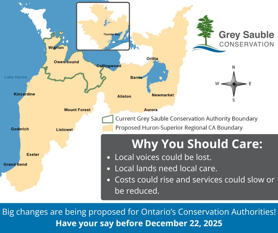 Grey Sauble Conservation Authority would become part of a region called the Huron-Superior Regional Conservation Authority, covering 23,500 km² and 80 municipalities.